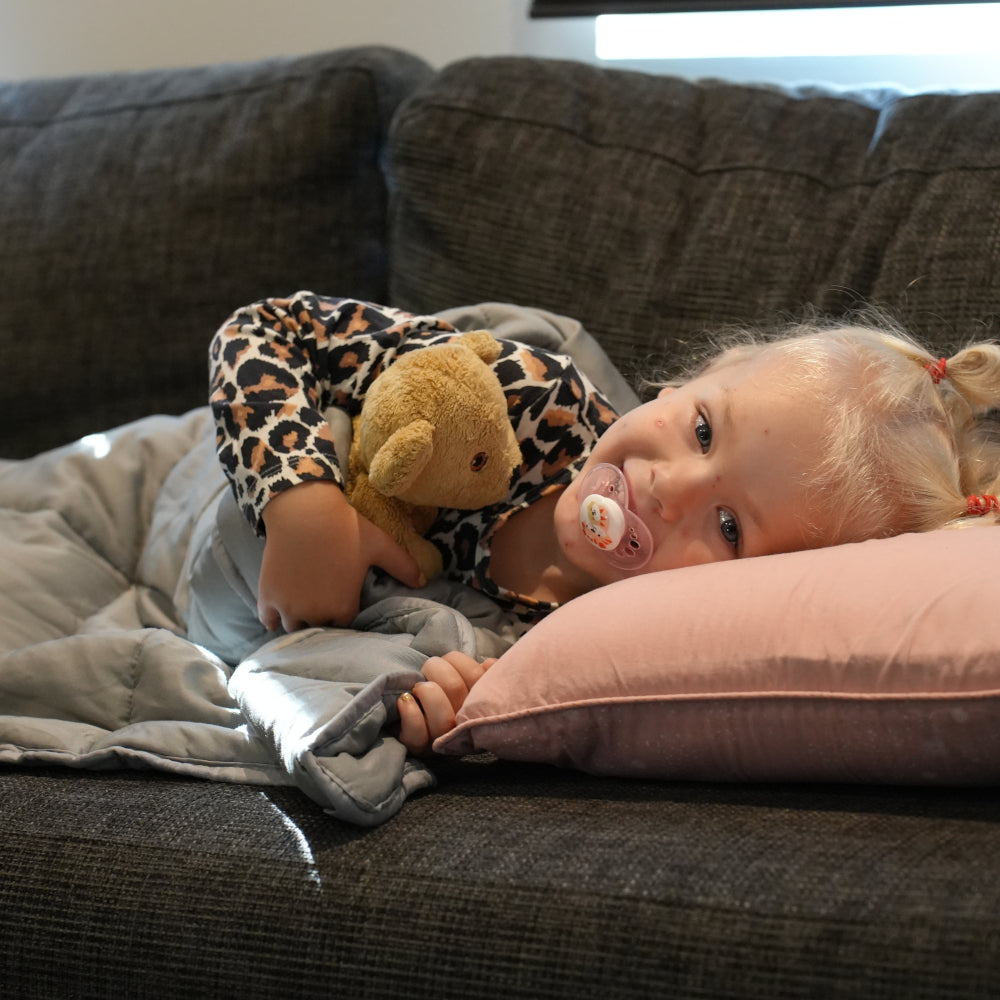 Vores tyngdedyne kan også bruges til børn. Til det har vi en specifik børnedyne som måler 100x140 cm, og vejer 3 kg.